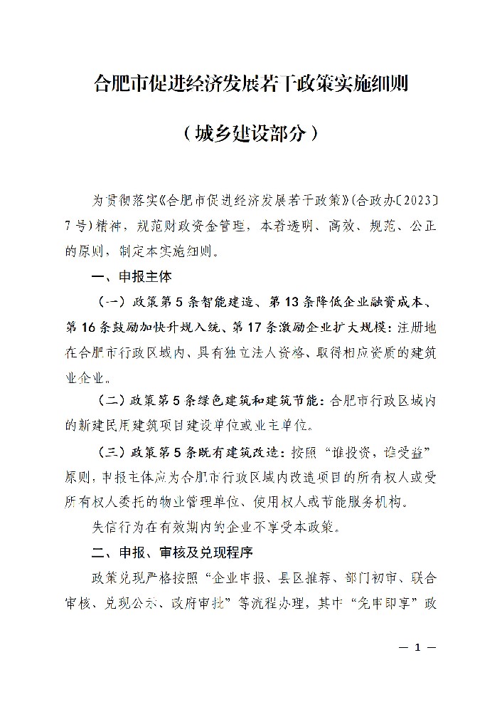 詳見《關于印發〈合肥市促進經濟發展若干政策實施細則(城鄉建設部分)〉的通知》(合建〔2023〕50號,附件1),申報材料紙質版請附封面(附件2)膠裝。